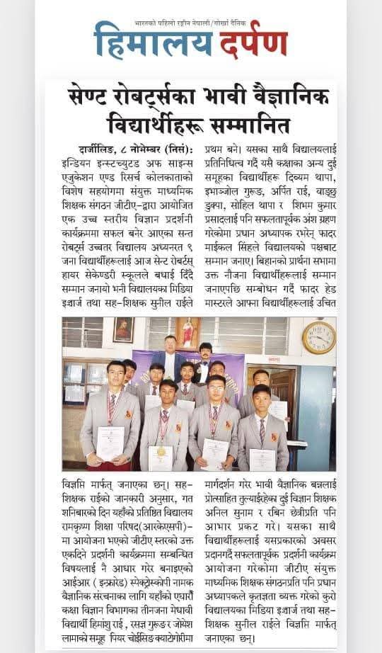 St. Robert's Higher Secondary school is situated in the picturesque hill town of Darjeeling and it is affiliated to the West Bengal Board of Secondary Education and the Council of Higher Secondary Education. It is a Catholic school established and administered by the Roman Catholic Diocese of Darjeeling. The School is under the religious jurisdiction of the Roman Catholic Bishop of Darjeeling.